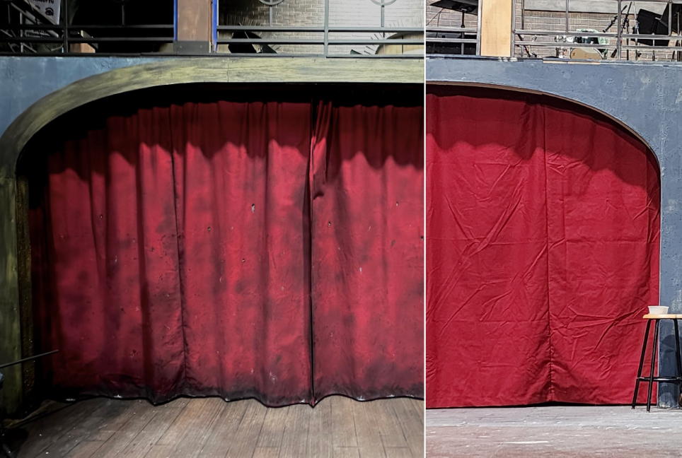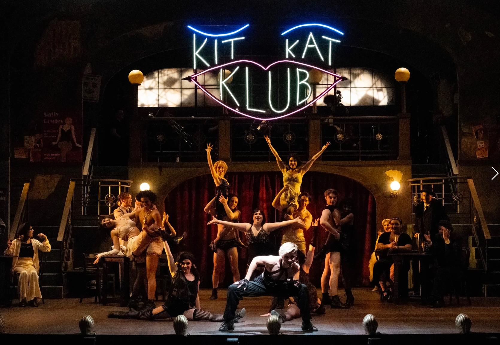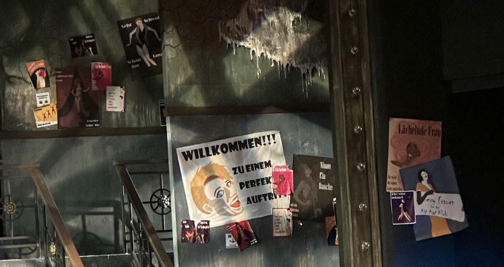 We are in the theatre of the seedy, run down Kit Kat Klub the entire production. The space is disgustingly dingy, but is full of theatrics. My role as assistant scenic designer was to help aid the design of the general atmosphere of the show. I was tasked with designing the Kit Kat Klub sign, designing and rendering all posters strewn across the set, and I played a role in aiding with the paint samples given to the shop in addition to being one of the people helping to lead the paint process in the shop.