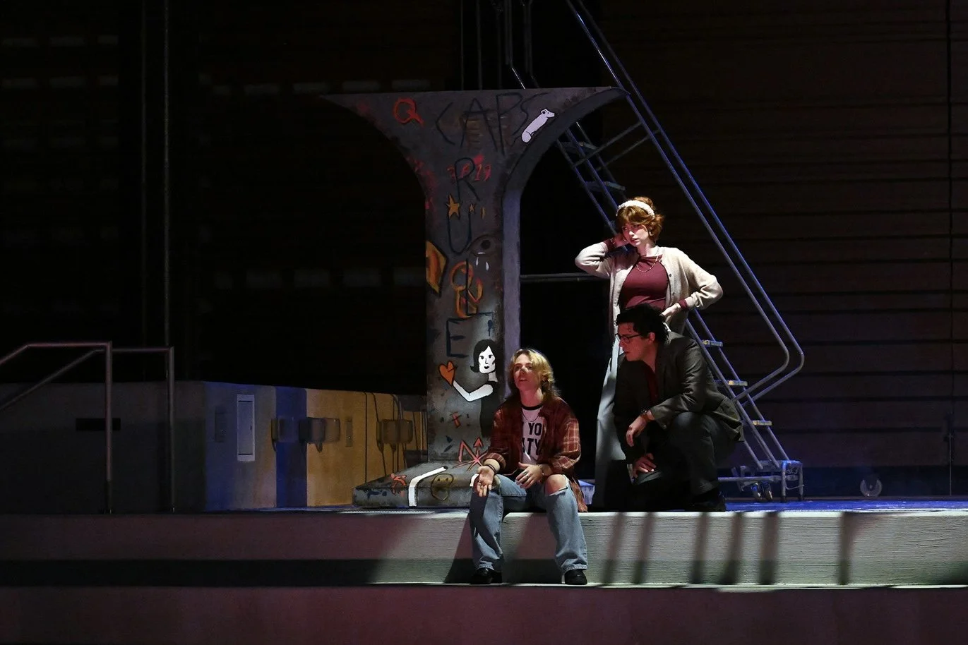 Graffiti was chosen to as means of distress to emphasize how young the characters are who die in battles with one another, as graffiti is often associated as a crime youths commit. The battle between the two families is represented by two opposing graffiti art styles. Capulets are the Banksy inspired graffiti - black, white, and blue color palette. Montagues are the Jean-Michel Basquiat inspired graffiti - red/pink, orange, and yellow color palette. The Capulet Estate/non graffitied side of the pillars are purposefully blank to show how while the upper class insights the political distress, it is the people who must face the aftermath of the violence.
