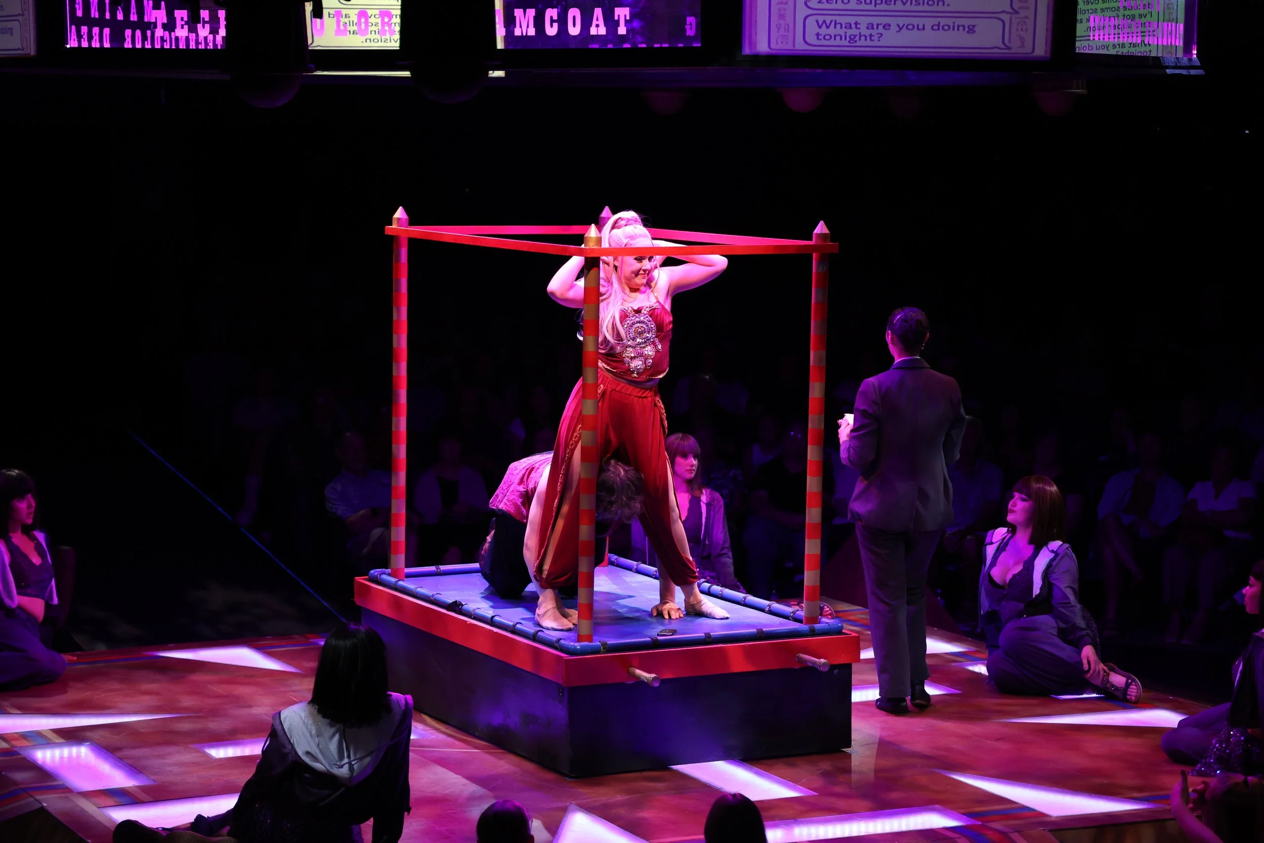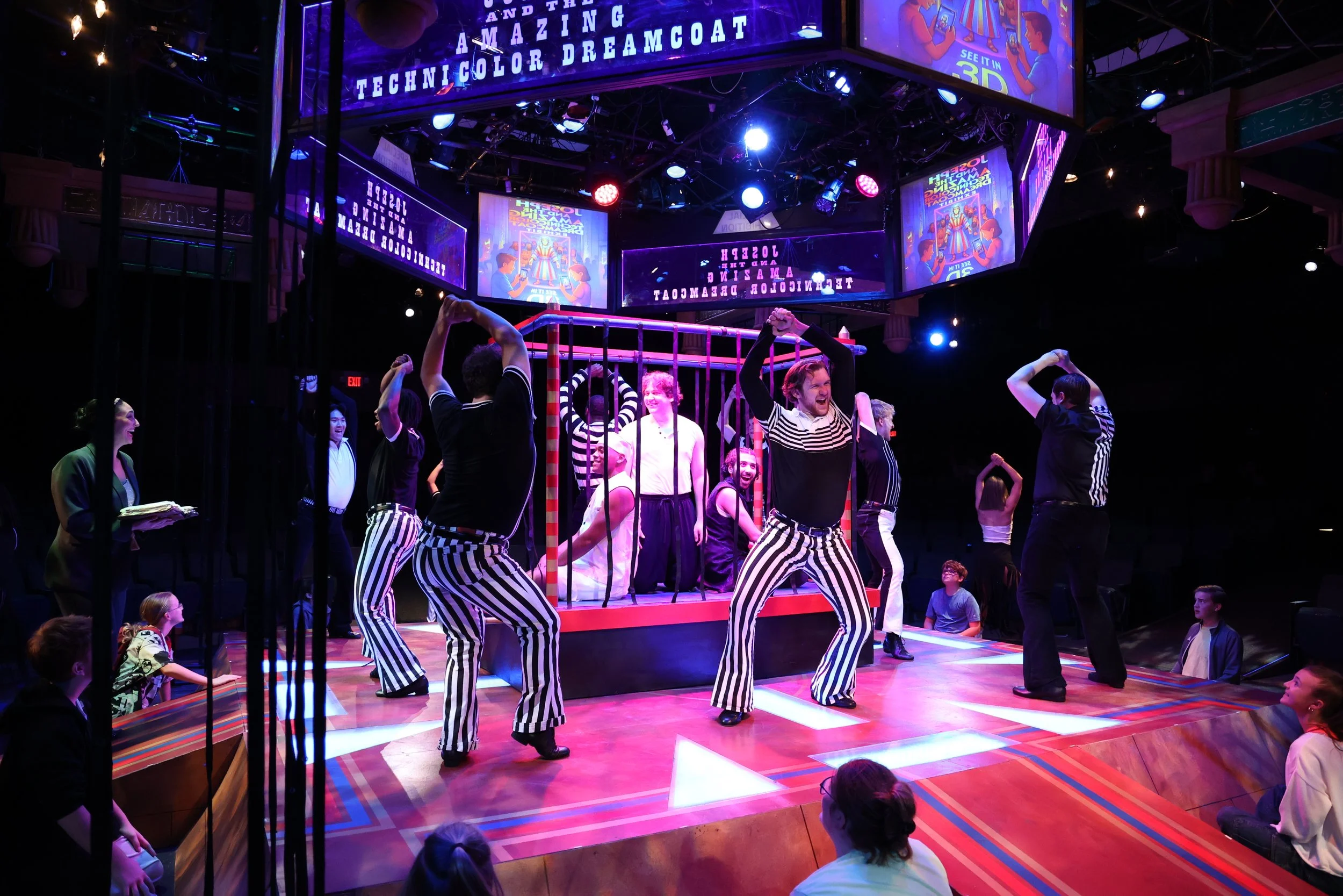 A dusty Egyptian landscape. The pyramids and and headers where painted with a jacksand mixture to create more visual texture for the audience to convey the grainy sand look the designer wanted to achieve. The base of the floor is a scumble of vibrant terracotta red hues. This elevated, but still slighlty neutral tone allow for the floor to be vibrant to match the tone of the play while also still being neutral enough to fit into the world of the musical.